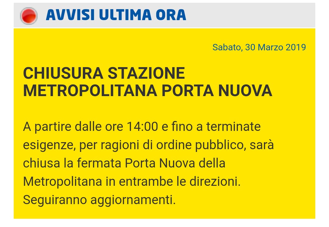 Per l’intera durata della manifestazione sono state deviate alcune linee del trasporto pubblico locale torinese. Gtt, infatti, ha modificato non solo la viabilità ma anche la dotazione di mezzi delle linee urbane. Per motivi di sicurezza, quindi, i tram sono stati sostituiti dai bus di linea. Limitazioni anche per il trasporto pubblico della metropolitana di Torino. Come confermato da Gtt, infatti, la stazione di Torino Porta Nuova resterà chiusa dalle 14,00 e fino alla fine delle esigenze di ordine pubblico, per entrambe le direzioni.